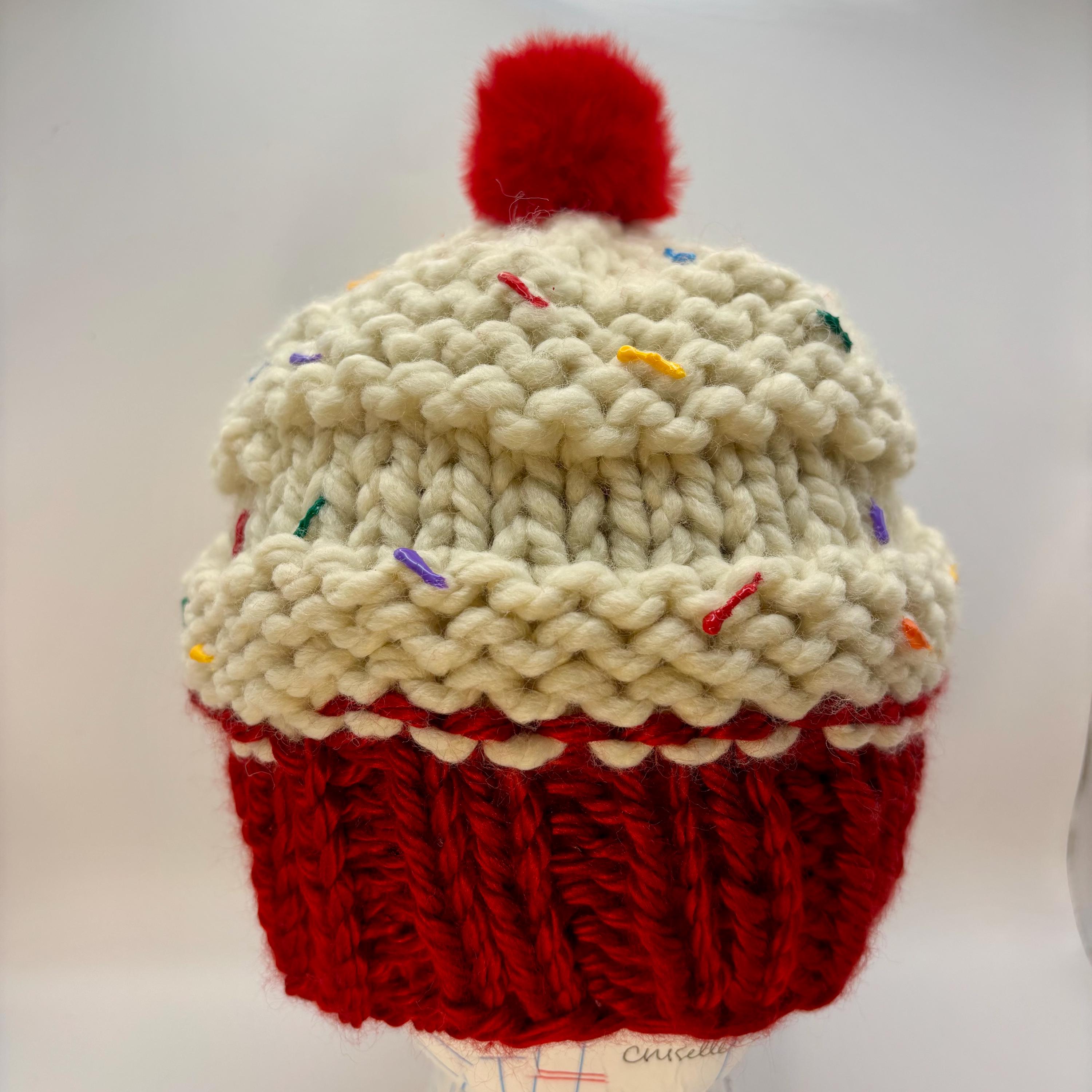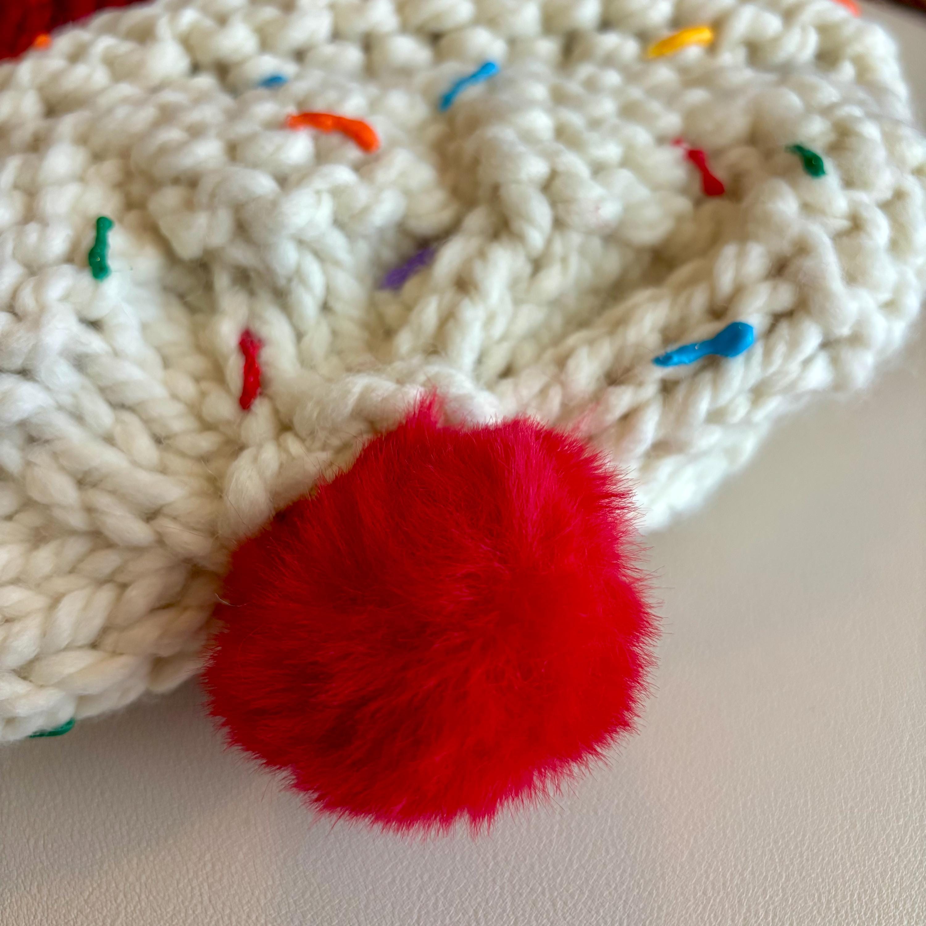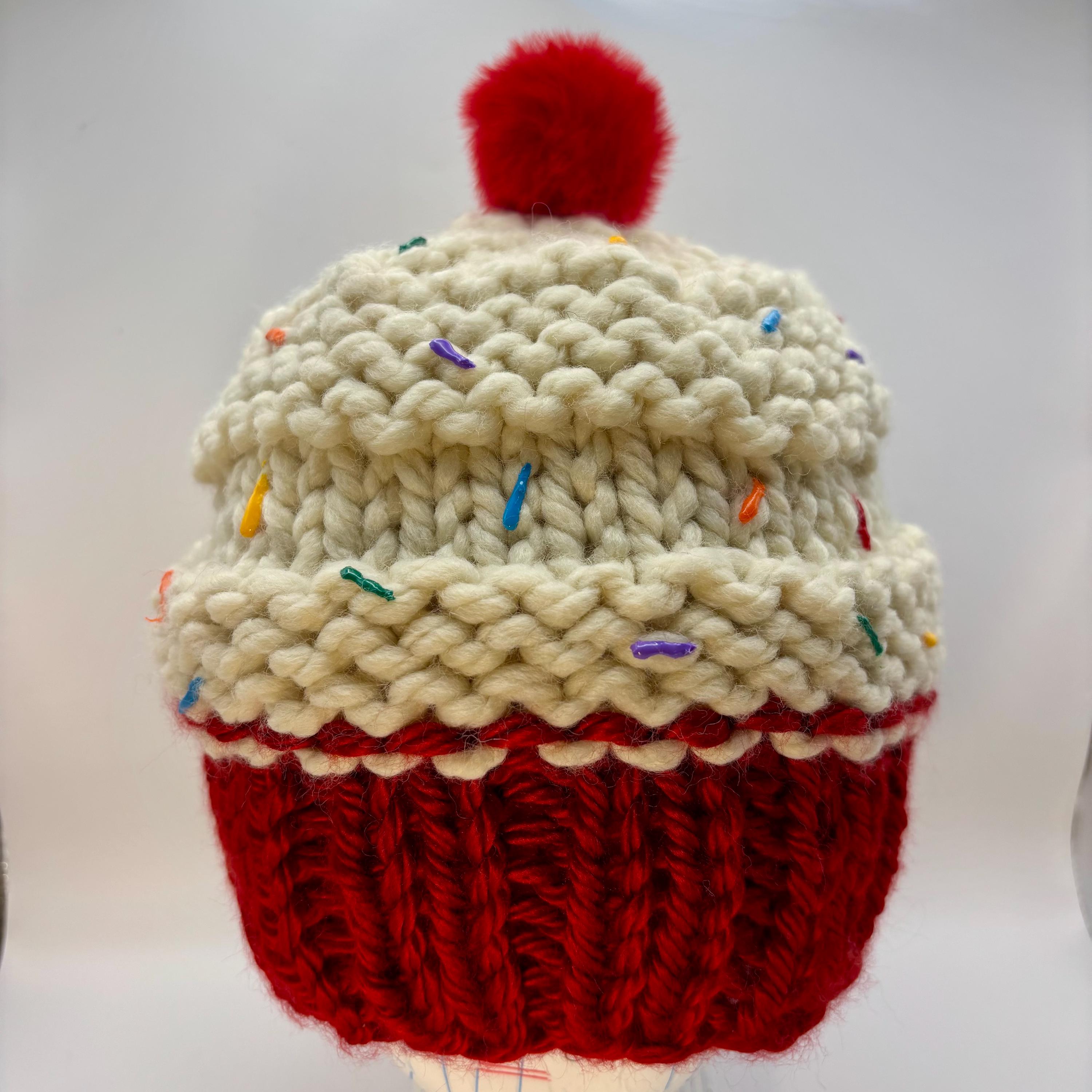 The red portion of the beanie, the wrapper, if you will, is made of red acrylic yarn. The white frosting portion is made of a wool and acrylic yarn blend.