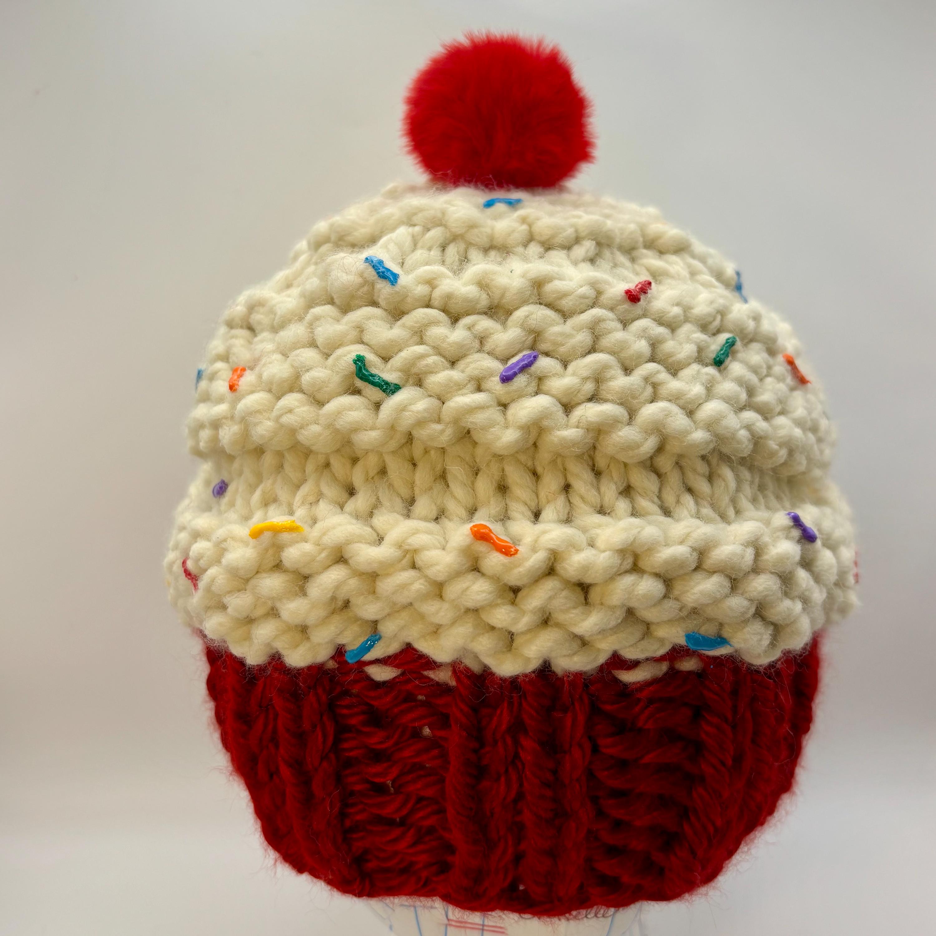 The red portion of the beanie, the wrapper, if you will, is made of red acrylic yarn. The white frosting portion is made of a wool and acrylic yarn blend.