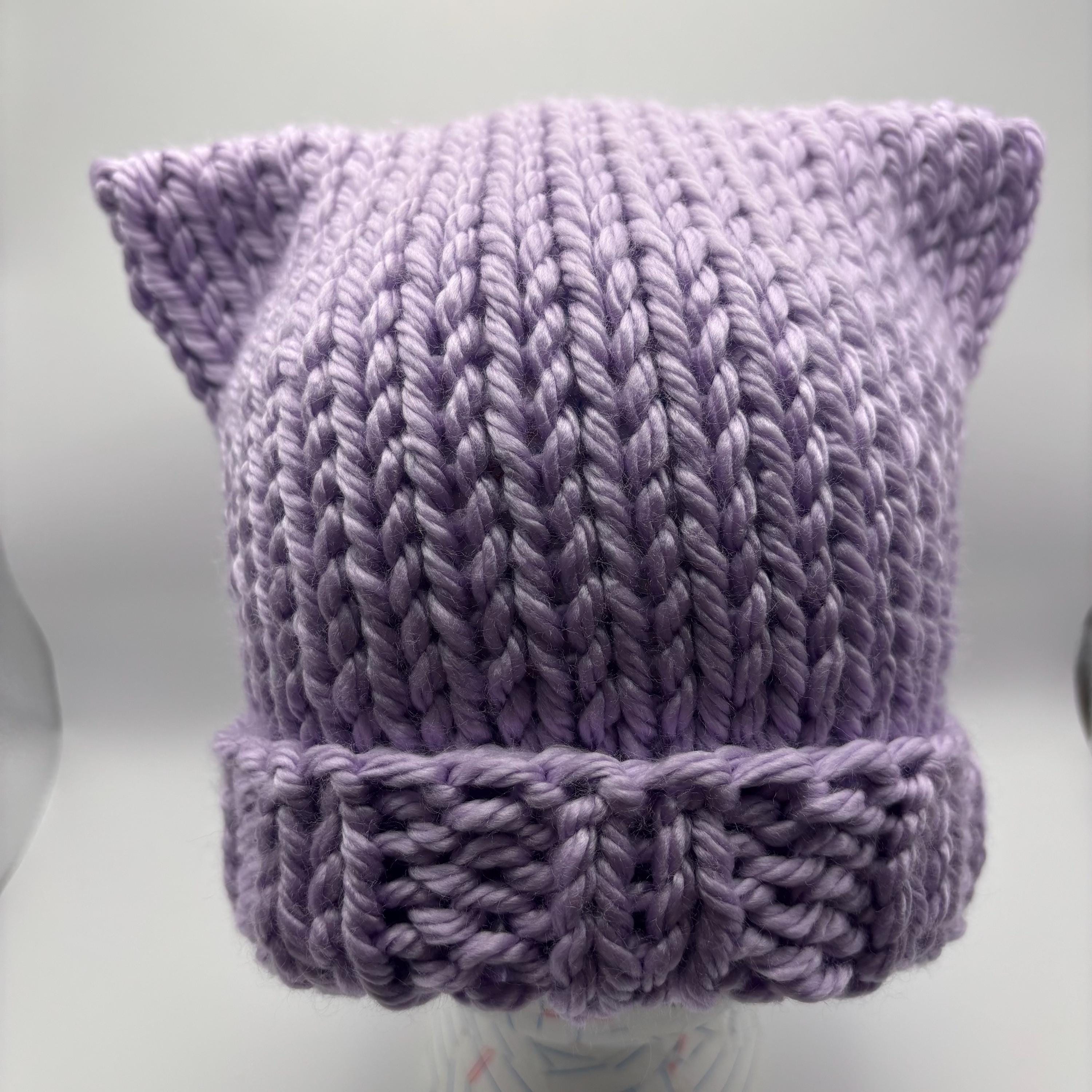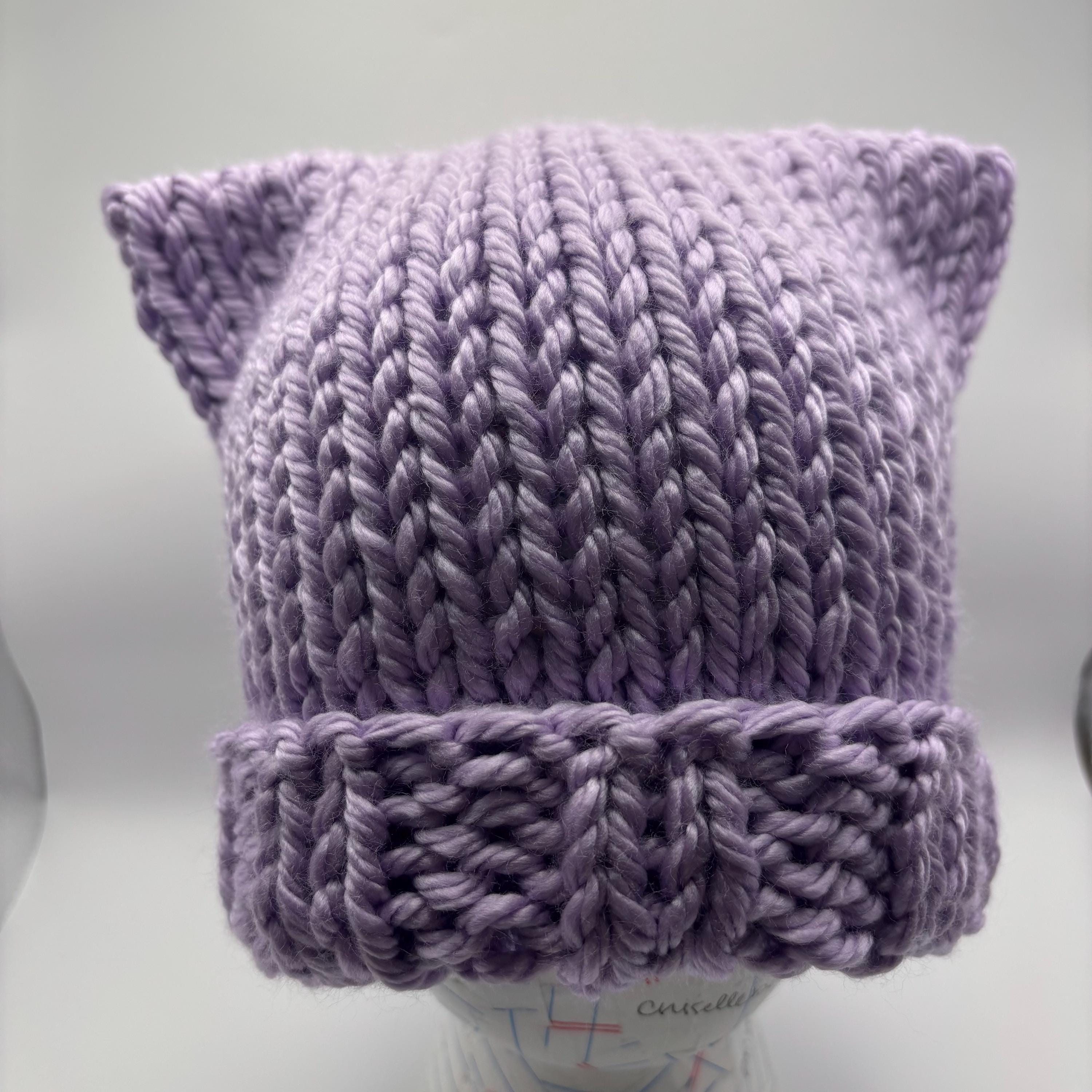 The kitty cat hat is hand knit with acrylic yarn; super soft and warm.