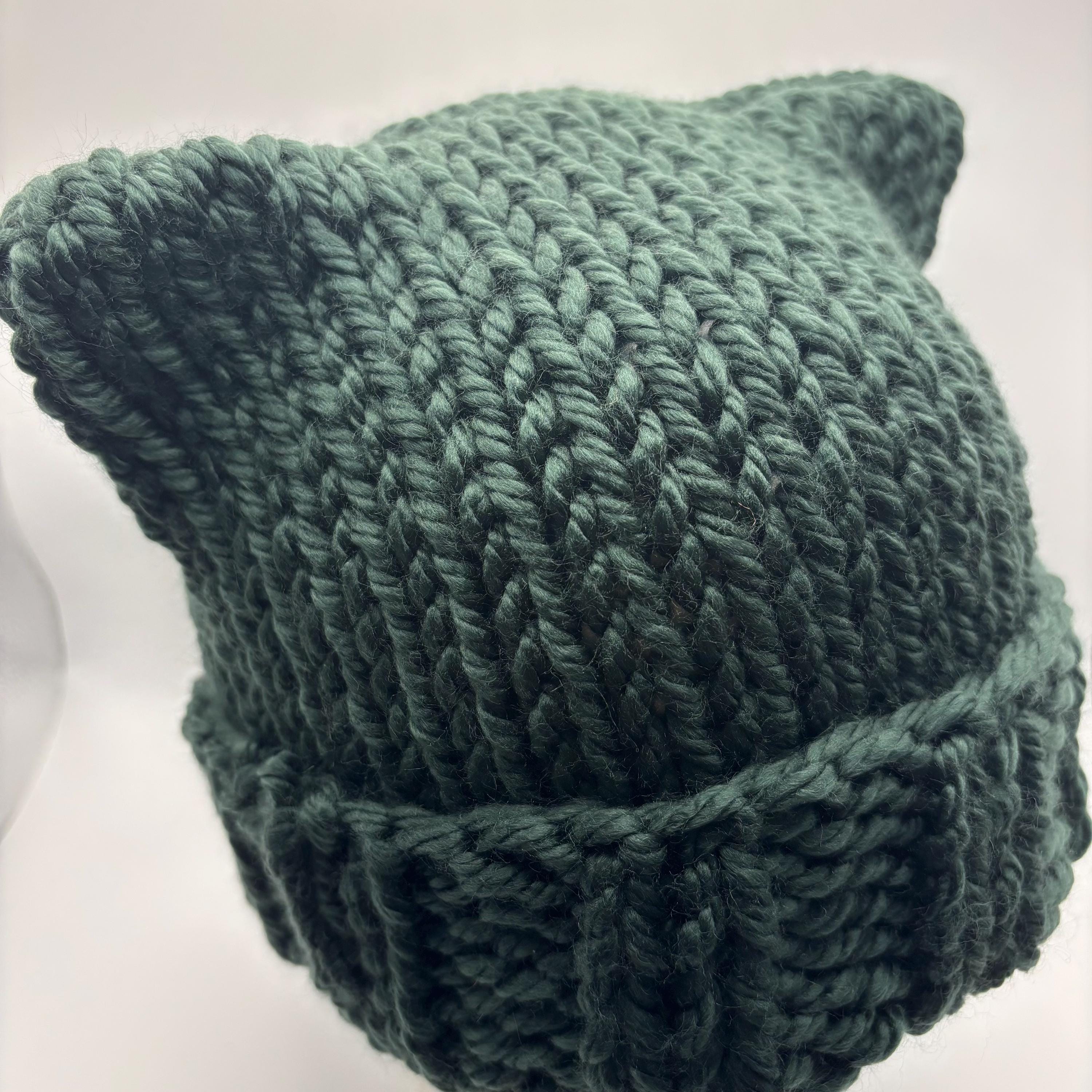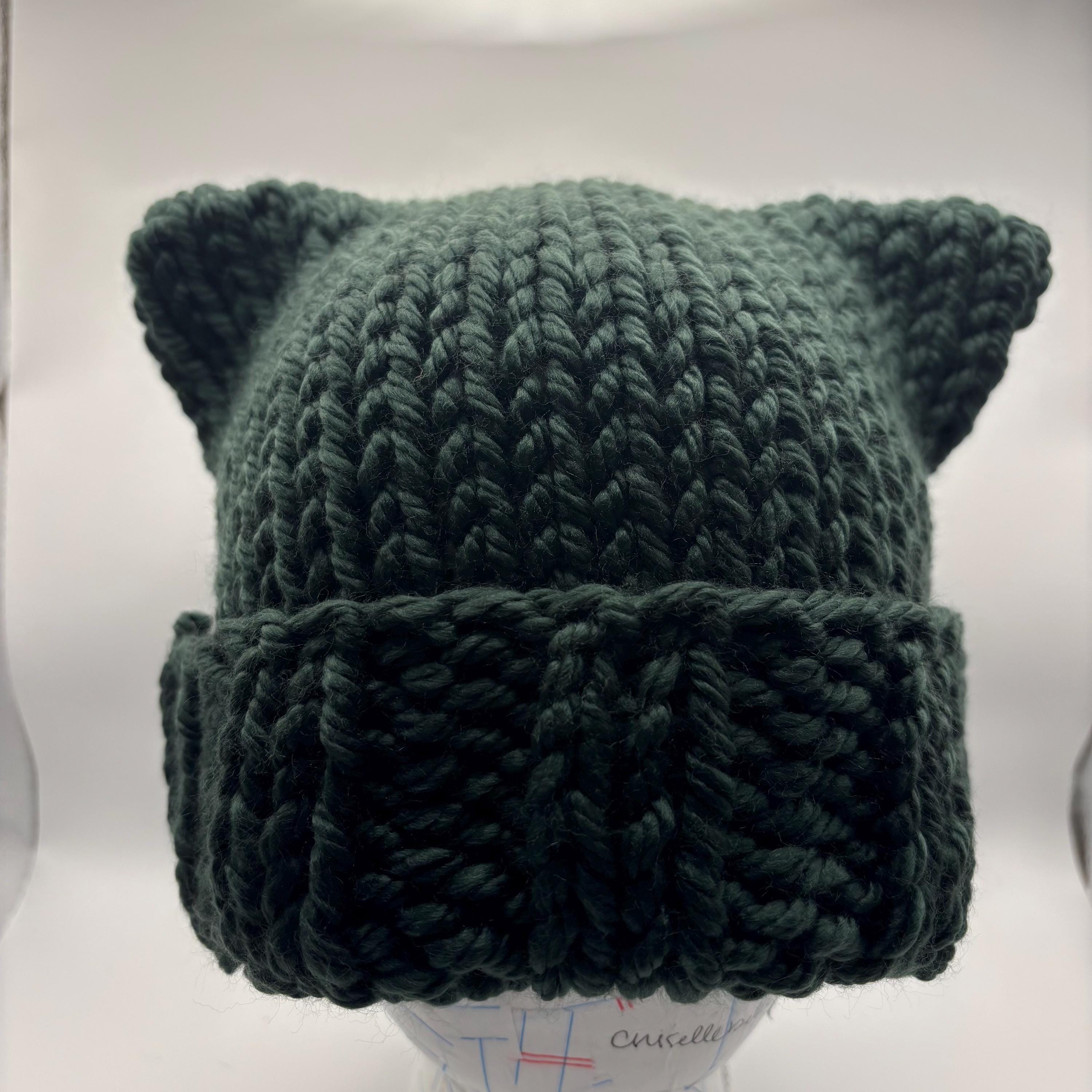 The kitty cat hat is hand knit with acrylic yarn; super soft and warm.