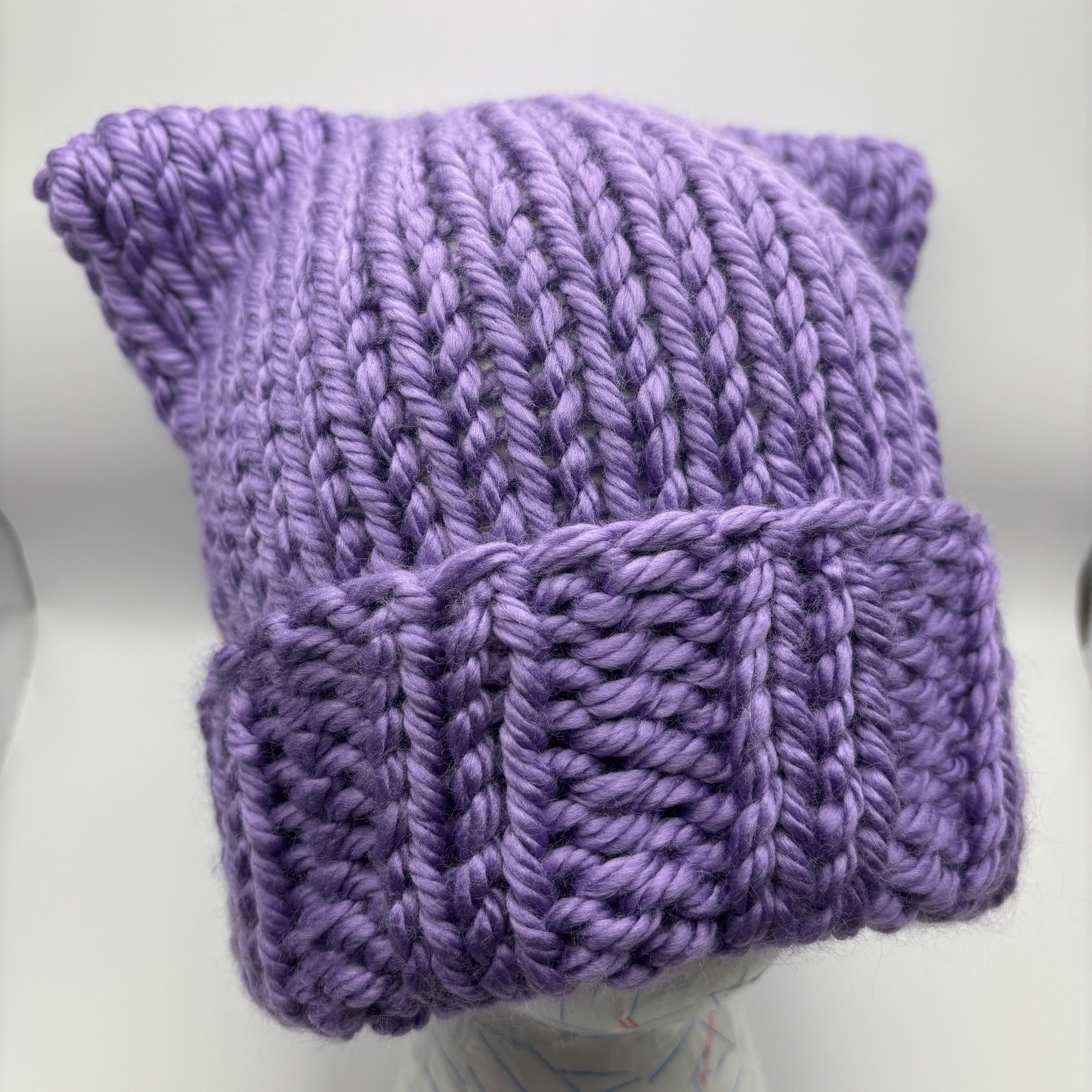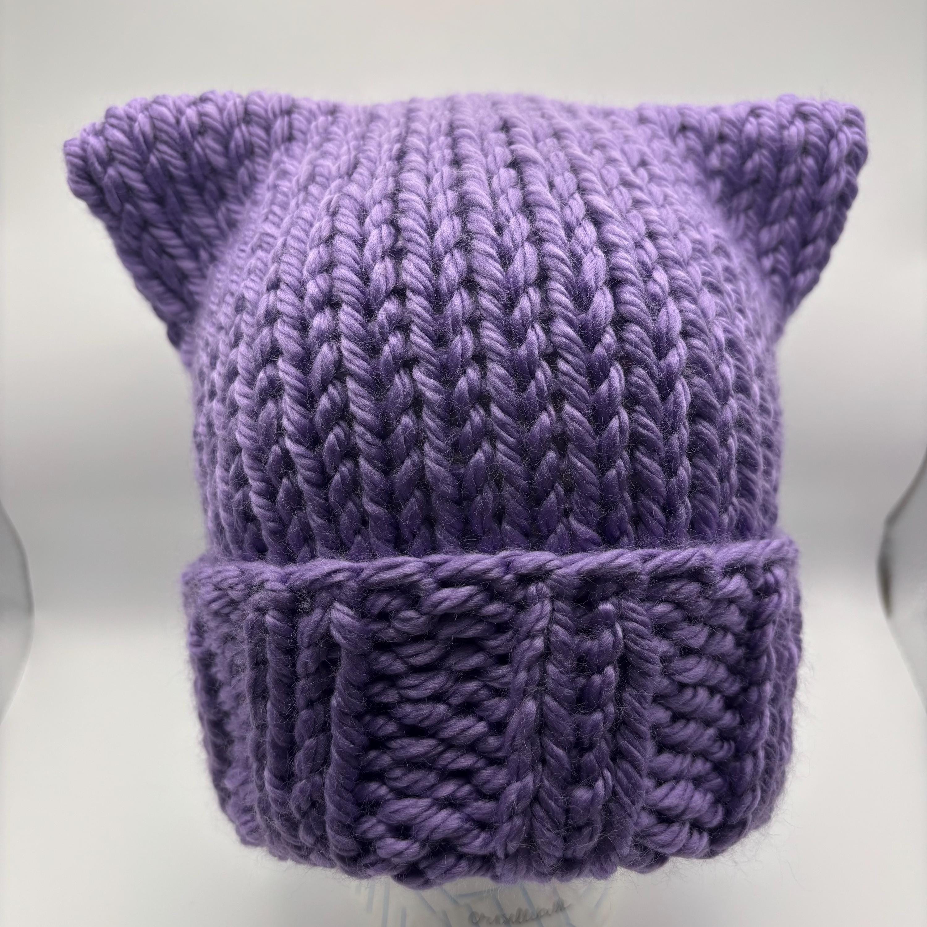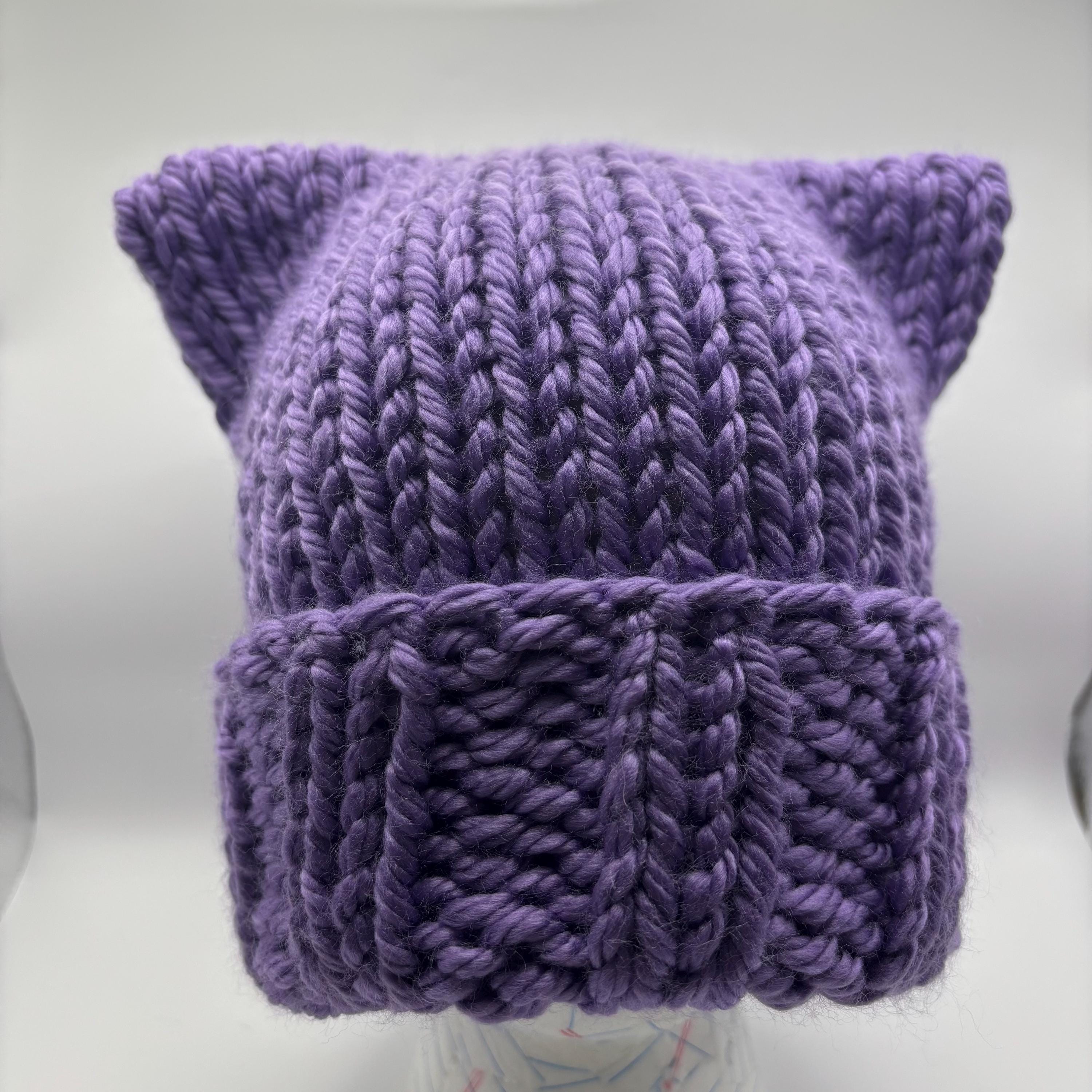 The kitty cat hat is hand knit with acrylic yarn; super soft and warm.
